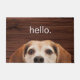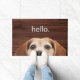 Bienvenue à vos invités chez vous avec une photo mignonne et drôle de JoDog le Beagle souriant qui vous espionne et le mot simple, "bonjour". sur un arrière - plan en bois foncé. Grand cadeau pour le chien ou l'amoureux des animaux ou comme cadeau de ménage. Photographie de JoDog et design © par TK Goforth, tous droits réservés.