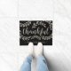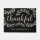 Tapis d'accueil personnalisé en noir chic et durable caractéristiques "reconnaissants" en écriture calligraphie lettrée à la main, entouré de feuilles et branches. Personnalisez-vous avec vos noms ou nom de famille le long du fond pour une façon parfaite d'ajouter la joie de l'automne à votre porte cette saison de Thanksgiving.