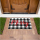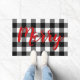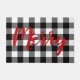 Texte rouge "joyeux" dans un style de police de calligraphie avec le casquette du Père Noël sur le buffle noir et blanc plaid.