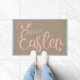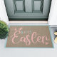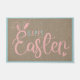 Ce mignon tapis de porte de Pâques présente un graphique amusant "Pâques heureuse" en pastels rose et bleu contre un arrière - plan faux burlap avec des oreilles lapins roses et un accent de coeur.