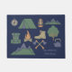 Ajoutez facilement le nom de votre terrain de camping favori et l'état dans lequel il est pour créer votre propre panier de camping souvenir ou ajoutez un nom de famille ou un autre texte pour créer votre tapis de bienvenue personnalisé pour votre cabine de vacances avec un collage de scènes de camping et de matériel de plein air en orange, tan, bleu clair et vert contre un arrière - plan bleu marine. Fait un cadeau cool pour les campeurs et tous ceux qui aiment le grand air. Il y a des illustrations de montagnes, d'une tente, d'un feu de camp, d'une lanterne, de bottes de randonnée et plus encore.