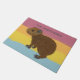 Ce tapis de bienvenue personnalisé convient parfaitement aux amateurs de capybaras. Il est prêt à être personnalisé avec votre nom et présente une illustration d'un bébé capybara ou capybara en brun contre un arrière - plan rayé coloré en rose, orange, jaune et bleu clair, en rose, couleur rose, orange.