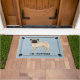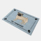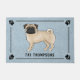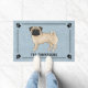 L'illustration originale de Destei d'un adorable chien de race Carlin couleur manteau. Le chien est debout et regarde vers le spectateur. La queue est courbée sur le haut du dos du chien. La couleur du corps est beige clair, mais il y a des détails plus foncés sur les oreilles, le museau et les yeux du chien qui donnent l'air d'un "masque noir" connu pour les Carlins de couleur fawn. Il y a aussi des ombres plus foncées sur le bout de la queue du chien. La bouche du chien est fermée et la couleur de l'oeil est marron. La couleur arrière - plan est bleue avec une texture décorative. La texture peut être enlevée et la couleur arrière - plan peut être changée en n'importe quelle autre couleur, si vous le souhaitez. Le design est encadré par une bordure élégante. Il y a également une silhouette empreinte de patte de chien dans chaque coin. Sous l'image de chien il y a un texte personnalisable sont pour un nom de famille ou d'autres textes personnalisés comme "bienvenue", par exemple.
