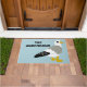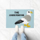 Ce tapis de porte ou tapis de bienvenue personnalisé présente une illustration de style dessin animé d'une mouette contre un arrière - plan bleu clair avec votre nom ou un autre texte en caractères gras et noirs.