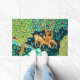Natte dans une conception de tapisserie de William Morris de trois cerfs communs près d'un ruisseau dans un arrangement de forêt d'imaginaire des arbres aux nuances doucement du vert et de l'aqua, sur un fond foncé de bleu d'indigo
