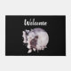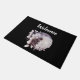 Tapis de bienvenue avec une aquarelle peinte d'un chat noir et un bouquet floral violet clair et rose. Devant une grande lune. Design et magique.