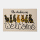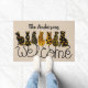 Cet adorable matelas d'accueil pour amoureux du chat présente 7 chattes stylisées, avec différents motifs de couleur or et noir dessinés à la main. Leur mignonne queue de chat écrit le mot "Bienvenue" Ajoutez une touche personnelle en ajoutant votre nom de famille.