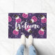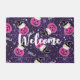 Un tapis de bienvenue avec une adorable motif à thème Halloween. Chats en casquette sorciers, assis sur des citrouilles roses avec des toiles violettes dans l'arrière - plan.