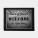 Chaussures svp de natte d'accueil de famille de signe de plaque d'acier. Le tapis de porte fait sur commande pour des amis, les familles, les voisins, les affaires, la société, le magasin, le magasin, le bureau, les nouveaux mariés, le M. et la Mme couple etc. ajoutent votre propre message de signe bienvenu d'amusement, adresse, numéro de maison, nom de famille, ont établi la date d'année, le monogramme, le nom de famille ou la citation humoristique. Idée mignonne de cadeau pour la nouvelle maison ou pendaison de crémaillère. Modèle élégant de typographie avec l'image de plaque métallique grise de texture d'arrière - plan de travaux de construction. Signe de natte de Personalizable avec la frontière. Créez votre propres tapis/couverture drôles d'entrée pour l'entrée principale, l'entrée ou le hall. Décor/décorations à la maison personnalisables pour votre maison. Idées à la maison de cadeau de décor de nouveauté. Disponible dans petit et grand/de grande taille.