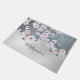 La partie inférieure comprend un champ de texte en feuille d'argent avec un nom personnalisé et un monogramme. La partie supérieure présente des fleurs de cerisiers rose pâle sur un arrière - plan bleu gris chatoyant. Cliquez sur : personnaliser le modèle pour changer le nom et le monogramme. Vous pouvez également accéder à la section calques et supprimer le monogramme, écrire un texte plus long, ou supprimer ou ajouter des éléments de conception.