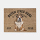 English Bulldog Porte d'accueil Amoureux des chiens personnalisé. Ce tapis de bienvenue peut être personnalisé avec le nom de votre chien, le slogan peut aussi être changé ou vous pouvez utiliser une photo de votre propre chien (assurez-vous qu’elle est transparente). Texte : Butch vit ici... Tous les traitements sont les bienvenus Modifier le design pour changer la police, les couleurs et la couleur arrière - plan. Lorsque vous remplacez l'image de votre chien, utilisez une image transparente. Fait un cadeau merveilleux pour une fête de ménage, vacances, amoureux de les chiens et la plupart de toutes les occasions.