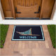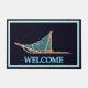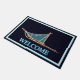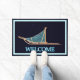 Un traîneau à chiens avec un sac turquoise sur un arrière - plan étoilé avec le texte "BIENVENUE" en bleu et blanc éclatant. Vous pouvez personnaliser ce tapis de bienvenue en ajoutant votre propre texte sur le sac de traîneau