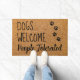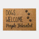 Bienvenue aux invités avec ce drôle de tapis de portes ! " Chiens Bienvenue, Gens Tolérés ". . Matelas de bienvenue - Manteau Empreinte de patte de sol de chien. Coeur rustique en imitation naturelle et design noir avec empreintes de pattes. DROIT D'AUTEUR © 2022 Judy Burrows, Black Dog Art - Tous droits réservés. Chiens de bienvenuePersonnes Tolérées Coir Rustique Funny Doormat chien