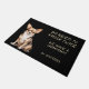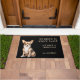 "Pas besoin de frapper deux fois, Nous avons un Chihuahua" déclare ce drôle de tapis de porte. Le texte est en bronze pâle sur le côté droit, tandis qu'une photo d'un adorable chien de Chihuahua est à gauche. Tout est placé sur un arrière - plan noir.