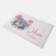 Un tapis de bienvenue avec l'image d'une paire de chouettes amoureuses assis ensemble sur une branche d'arbre. Entouré de jolies fleurs bleues, vertes et roses.
