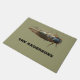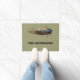 Bienvenue aux invités ou peut-être les effrayer avec ce tapis de porte qui présente une photo géante d'une cigale aux yeux rouges. En dessous du bogue se trouve un espace pour ajouter un nom ou un autre message en gras en lettres noires. La photo et le texte sont placés contre un arrière - plan de couleur vert olive.