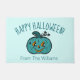 Obtenez cette jolie Jack-o'-lantern turquoise citrouille Happy Halloween tour ou de traiter le tapis de porte pour que les familles qui ont des enfants allergiques savent que vous offrez des friandises non alimentaires et allergiques. Personnalisez avec votre nom de famille !