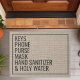 Cette conception amusante de paillasson présente les mots "Clés, Téléphone, Sac à main, Masque, Désinfectant pour les mains, Eau bénite". Personnalisez ce joli tapis de porte en faux similicuir rustique avec vos propres rappels personnalisés avant de quitter la maison. Le cadeau parfait et unique pour une crémaillère ou pour les nouveaux propriétaires.
