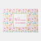 Porte de bienvenue avec un motif délicieux et fantaisiste. Coeurs, lettres d'amour, muffins, tulipes et cerises apportent joie et bonheur à ce mignon petit motif. Jolies couleurs pastel. Un carré blanc avec une fausse bordure en feuille d'or superposée avec votre texte à l'intérieur.