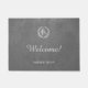Tapis de porte du salon de coiffure avec logo de ciseaux en argent faux métallique et script de barbier sur un look arrière - plan en cuir gris foncé