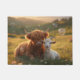Capturez la magie de la campagne avec cette image fantaisiste d'un mignon veau Highland et d'une adorable chèvre, en se relaxant dans un champ sous la lumière dorée avec des bulles flottantes.