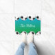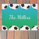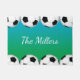 Les bordures de ballon de football sur un arrière - plan bleu et vert avec votre nom de famille personnalisé, monogramme, ou autre texte au milieu font un matelas amusant pour une famille aimant le football.