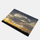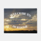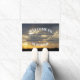 Invités Invitations dans votre maison avec ce tapis de porte unique avec ma photo originale, "Sunset Through The Clouds". La photo présente une silhouette de sommets d'arbres, au loin. Sur le dessus de l'hôtel, il y a des nuages gris et doux, avec des ouvertures qui laissent passer le soleil couchant. Sous les nuages gris se trouve un ciel jaune doré. Le texte en voûte blanche et gras dit "BIENVENUE À NOTRE MAISON". Le texte écrit par script, dans le centre peut être personnel avec votre nom. (Exemple : Les Smiths; M. & Mme Smith; John & Mary Smith)