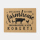 " Accueil texte à notre ferme" avec 1 silhouette de vache, 2 poulets (1 poule, 1 coq), plus une guirlande de feuille et un feuille en baisse. Ajoutez votre nom de famille à cette natte rustique chic de ferme avec un arrière - plan de toile de jute de faux et des silhouettes noires - perfectionnez pour des agriculteurs et les amants de la ferme regardent.