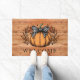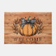 A cute coquette style fall orange pumpkin welcome doormat with coquette bow and fall leaves foliage on a rustic barn wood background. Rustic earthy orange and black hues. Welcome your guests at Thanksgiving, the holidays, and the fall season.