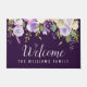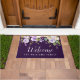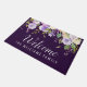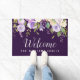 typographie d'accueil avec nom de famille et aquarelle violet et fleurs de pêche. Vous pouvez modifier les couleurs et le texte de ce tapis