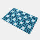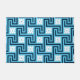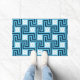 Tapis de porte dans une clé grecque Art déco ou motif de labyrinthe en bleu ciel doux et bleu foncé marine / indigo, accentué de blanc