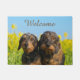 Le sanglier deux adorable a coloré les chiens d'une chevelure de teckel de fil côte à côte devant les fleurs fleurissantes jaunes de viol. Une photo drôle mignonne de chienchien prise par Katho Menden. Cet accueil de natte est une idée de cadeau pour des amoureux de les chiens. http://www.zazzle.com/kathom_photo -- Personnalisez-le avec votre nom ou texte. --