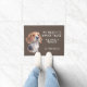 "Pas besoin de frapper deux fois, Nous avons un Beagle" déclare ce mignon tapis de porte. Le texte est en blanc à droite, tandis qu'une adorable photo d'un beagle marron, noir et blanc est à gauche. Tout est posé sur un arrière - plan gris brun.