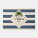 Établissez votre porte d'entrée avant ou patio avec ce tapis de porte Monogram de plage Tropical Blue Stripes. Il s'agit d'un design élégant avec un arrière - plan rayé bleu et blanc poussiéreux et un palmier au centre. Le monogramme de famille initial est en gris clair et le nom est en écriture calligraphie noire. Cliquez sur l'option Personnaliser le modèle et suivez les invites.