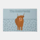 Créez une touche personnalisée pour votre entrée lorsque vous ajoutez un nom à ce tapis de bienvenue. Il présente une jolie illustration d'une vache écossaise Highland avec sa langue en retrait contre un arrière - plan à pois bleu pâle. Votre nom ou autre texte apparaît au-dessus du graphique en coordonnant les lettres bleues.