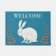 Ce tapis de porte d'accueil extérieur a un élégant lapin blanc assis entre les hauts plantes oranges feuillus sur un arrière - plan bleu foncé. Customisez le texte de bienvenue avec le modèle.