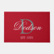 Élégant Monogramme rouge Date d'établissement mat de porte Conçu avec personnalisable rouge foncé arrière - plan et gris clair monogramme initial sur le centre. Personnalisé avec le nom de famille du couple en écriture de calligraphie blanche classe et année établie en chiffres blancs sur le centre inférieur avant. Faites une grande idée de cadeau de douche à la maison ou à la nuptiale.