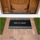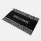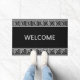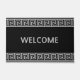 Elégant Motif grec gris sur tapis de porte d'accueil noir. Le texte de bienvenue peut être personnalisé.