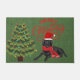 Elégant design pratique du labrador magnifique sur le tapis vert de porte de burlap. Ce design est beau à bien des égards et pratique en même temps. Un design de natte pour les amateurs de labrador noir. Le texte Joyeux Noël est rouge et dans un magnifique script. Bienvenue et labrador drôle portant un chapeau santa et foulard de Noël.