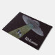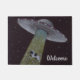 Un dessin au crayon couleur d'une vache malheureuse enlevée par des aliens dans une soucoupe volante, une nuit sombre et étoilée. Le troupeau effrayé s'agite dans l'arrière - plan.