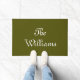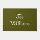 Chic olive vert Custom script Couple nom de famille Doormat. Texte blanc personnalisable, mousse d'olive vert uni couleur uni arrière - plan.