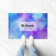 Un tapis de bienvenue avec un arrière - plan abstrait cosmique. Couleurs vives et éclatantes de bleu clair, rose et violet. Des étoiles blanches éparpillées un peu partout.