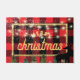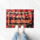 Paillasson de rennes clair pour la fête de Noël. L'image de l'arrière - plan est rouge et noir de buffle plaid. Le cadre est doré. Le décor est plus léger, rennes noirs, forêt et neige.