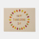 Ce somptueux tapis de portes présente une image art numérique d'une série de feuilles de chêne dans les tons rouge, orange, jaune et vert disposés en cercle autour d'un texte avec des lettres alternées de rouge, jaune, orange et vert qui dit Bon thanksgiving Day.