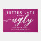 Accueillez vos invités avec humour et style à l'aide de ce tapis de bienvenue girly, drôle. Doté d'une police manuscrite blanche moderne sur un arrière - plan magenta élégant, le message ludique "Better Late Than Ugly" ajoute une touche amusante à toute entrée. Ce tapis de portes personnalisable vous permet de le personnaliser avec votre propre texte, comme votre adresse ou tout message que vous souhaitez afficher. Parfait pour ajouter une touche unique et accueillante à votre décor tout en créant une atmosphère conviviale. Une façon pratique et élégante d'accueillir les visiteurs, ce tapis de bienvenue personnalisé est un cadeau idéal pour les ménagères ou toute occasion.