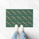Un petit tapis de sol arty utilisant des flamants roses couleur eau et des feuillages tropicaux dans un design formel sur un vert foncé pratique.