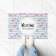 Paillasson de bienvenue avec un motif avec une ambiance estivale amusante. Flamants roses et ananas posés sur un motif rayé bleu clair avec feuilles et coeurs tout autour.