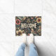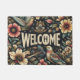 C'est un paillasson avec un arrière - plan noir qui a des fleurs et des oiseaux.