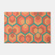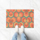 Ce tapis de porte a un design géométrique d'hexagones en ensembles de trois qui ressemblent à des fleurs en or, orange et rouge sur un champ de turquoise.