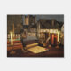 "Un jeu en 3D surréaliste sur la perspective créée en Vue. Dans l'arrière - plan est une rue médiévale tranquille en fin d'après-midi, la lumière chaude du soleil couchant rehaussée par les lampes qui brûlent le long des murs. Des maisons à colombages et des auberges aux toits de chaume bordent la rue, et derrière elles est visible contre le ciel une haute tour carré avec quatre tourelles d'angle. Cette scène à grande échelle se fond dans une petite vie morte à l'avant-plan montrant un bureau jonché de livres. Les livres sont aussi grands que le mur en pierre et les maisons qu'ils penchent contre, et la rue pavée se fond doucement dans le grain de bois de la table. En plus des livres, il est assis sur le bureau un stylo plume et une bouteille d'encre, une boussole, un sablier, une loupe montée et une lettre de parchemin avec un sceau officiel. Deux bougies éclairent le bureau avec une douce lueur tandis que les lampes éclairent la rue."